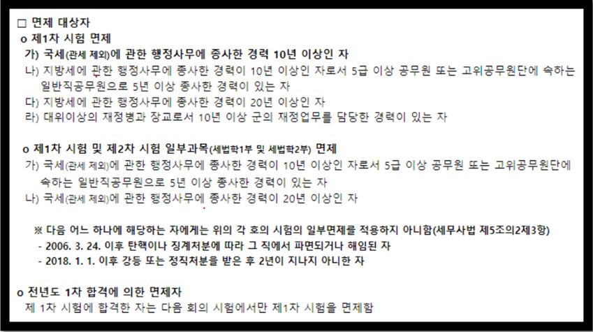 1차 시험은 재정학, 세법학 개론, 회계학개론, 선택법(상법, 민법, 행정소송법 중 택 1), 영어 총 5과목이다. 단, 영어 과목은 공인어학성적으로 대체한다. 인정되는 공인 영어 시험들 중 하나에서, 기준 점수 이상(TOEFL PBT 530점, TOEFL iBT 71점, TOEIC 700점, TEPS 340점, G-TELP Level 2 65점, FLEX 625점)을 취득하면 된다. 시험은 1교시, 2교시로 나누어 치러진다. 1교시는 재정학, 세법학 개론 두 과목이다. 과목당 40문항으로 총 80문항이다. 시험시간은 9:30~10:50이며, 80분이다. 2교시는 회계학계론, 선택법(상법, 민법, 행정소송법 중 택 1) 두 과목이다. 1교시와 같이 과목당 40문항 총 80문항이다. 시험시간은 11:20~12:40이며, 80분이다. 특이사항으로 1차 시험 면제 대상자도 있다. 이럴 경우 공인 영어성적도 제출할 필요가 없으며, 2차 시험만 응시해어 합격하면 세무사 자격증 취득이 가능하다. 경우에 따라 2차 시험 일부과목 까지 면제 되는 경우도 있다(아래 사진에 있는 내용을 참조).