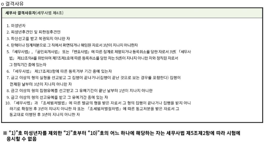 세무사 응시자격은 특별한 결격사유를 제외하고 별도의 제한이 없는데, 세무사법 제4조에서 규정하고 있는 세무사 결격사유자가 아니면 된다. 결격 사유로는 미성년자, 파산선고를 받고 복권되지 아니한 자, 금고 이상의 형의 선고유예를 받고 그 유예기간 중에 있는 자 등 총 10개의 경우가 있다(아래 사진에 있는 내용을 참조).