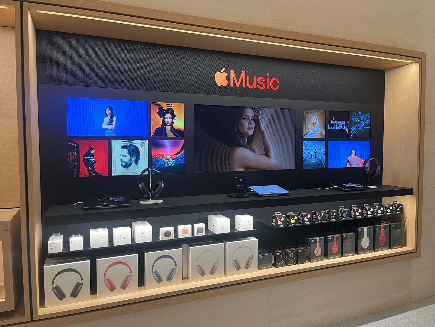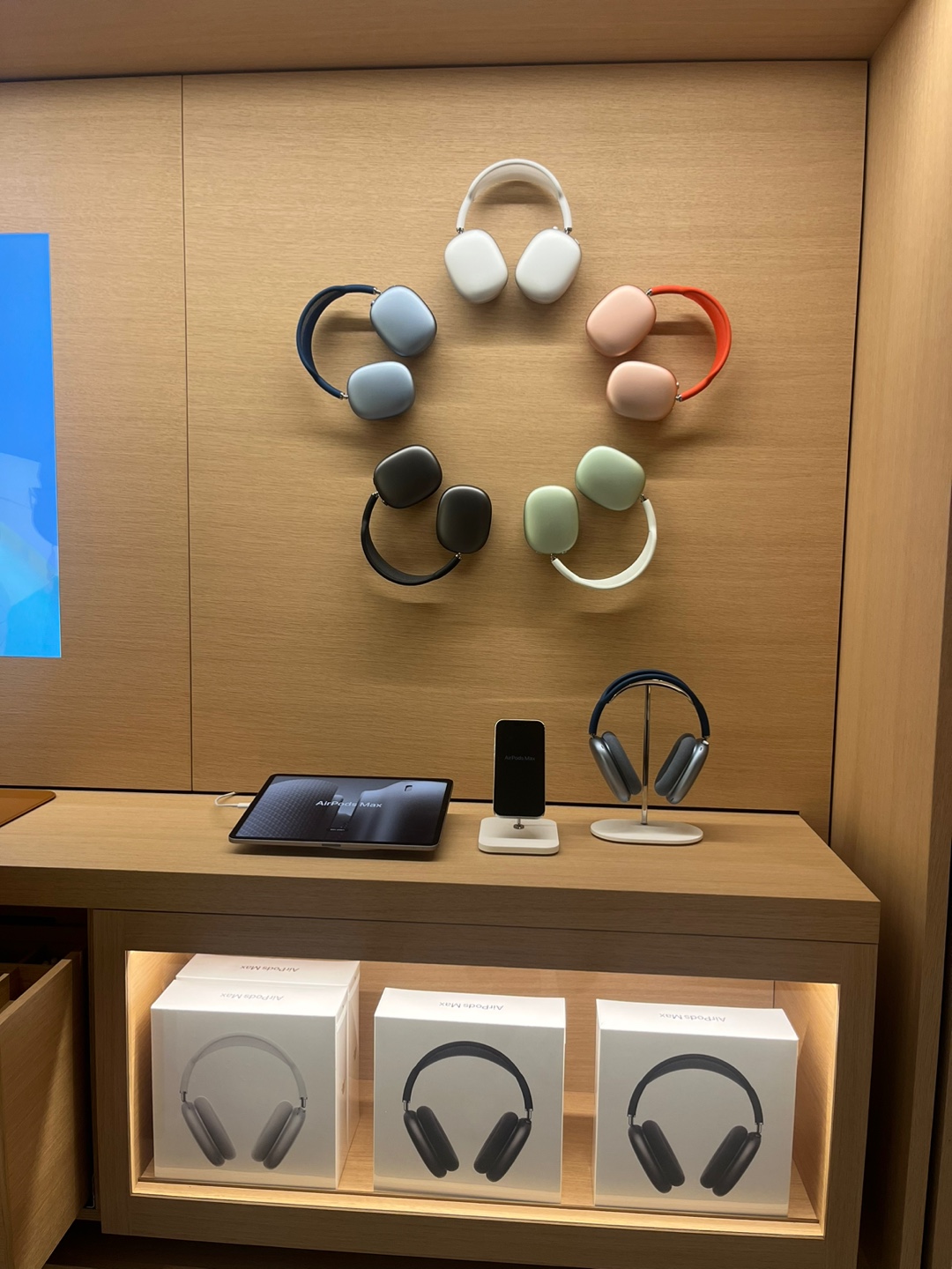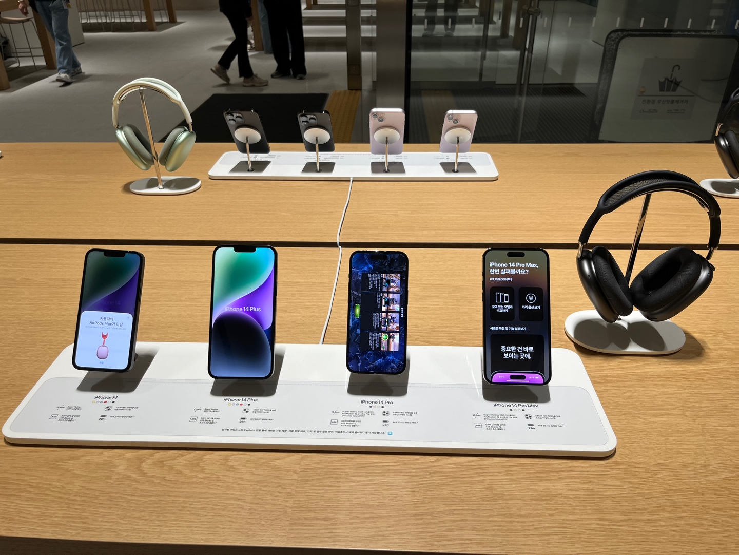 에어팟 맥스는 착용해 봤는데요. 노이즈캔슬링 기능이 워낙 좋아서 앞에 사람이 말하는 것도 잘 안들리더라고요. 이렇게 직접 착용하고 이용할 수 있도록 전시되어 있답니다.