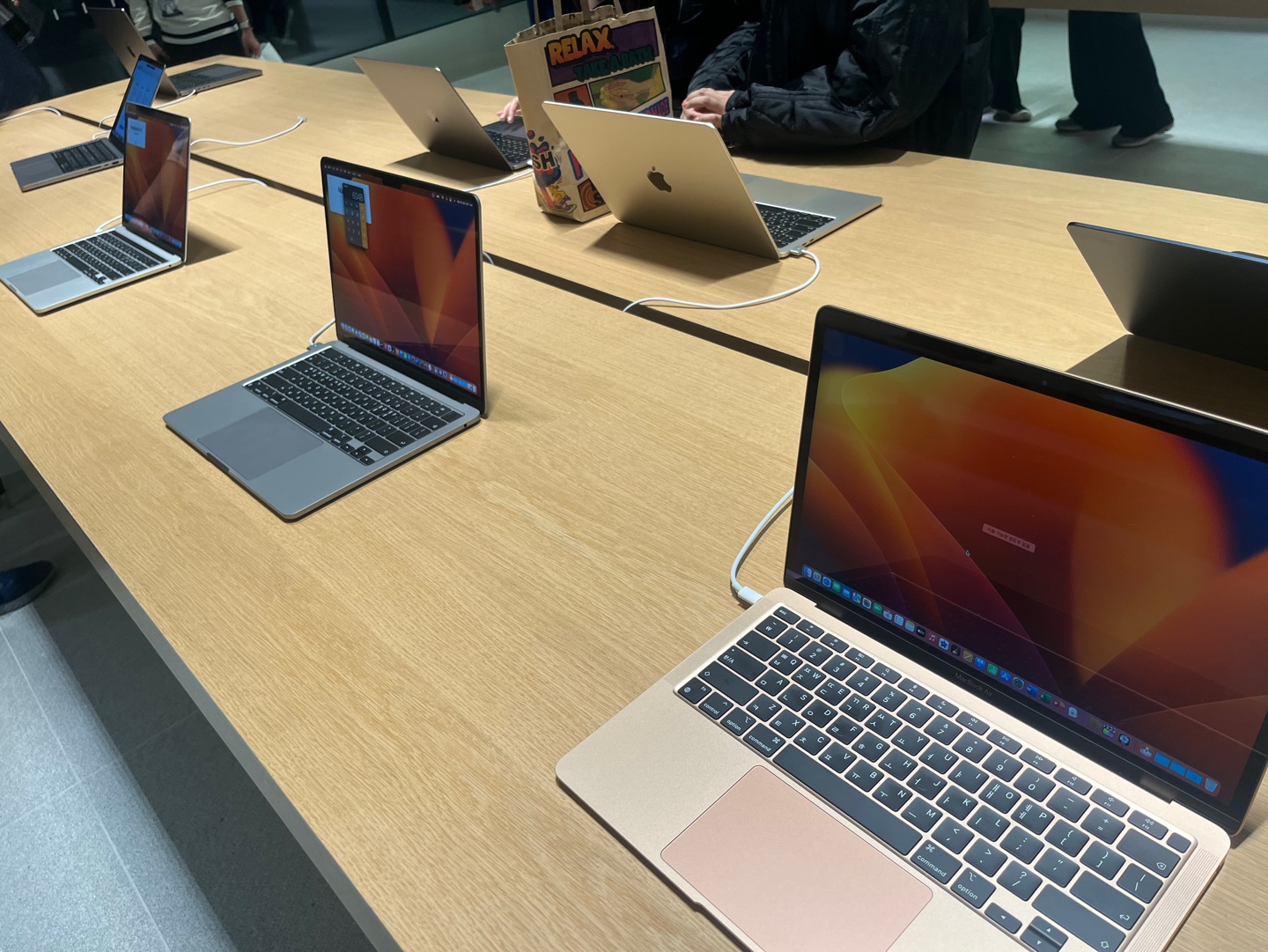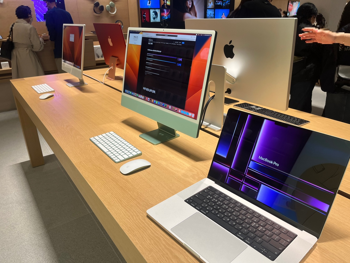 들어가서 출입구를 기준으로 왼쪽 끝 테이블부터 아이맥, 맥북, 아이패드, 에어팟 맥스가 나열되어 있습니다.