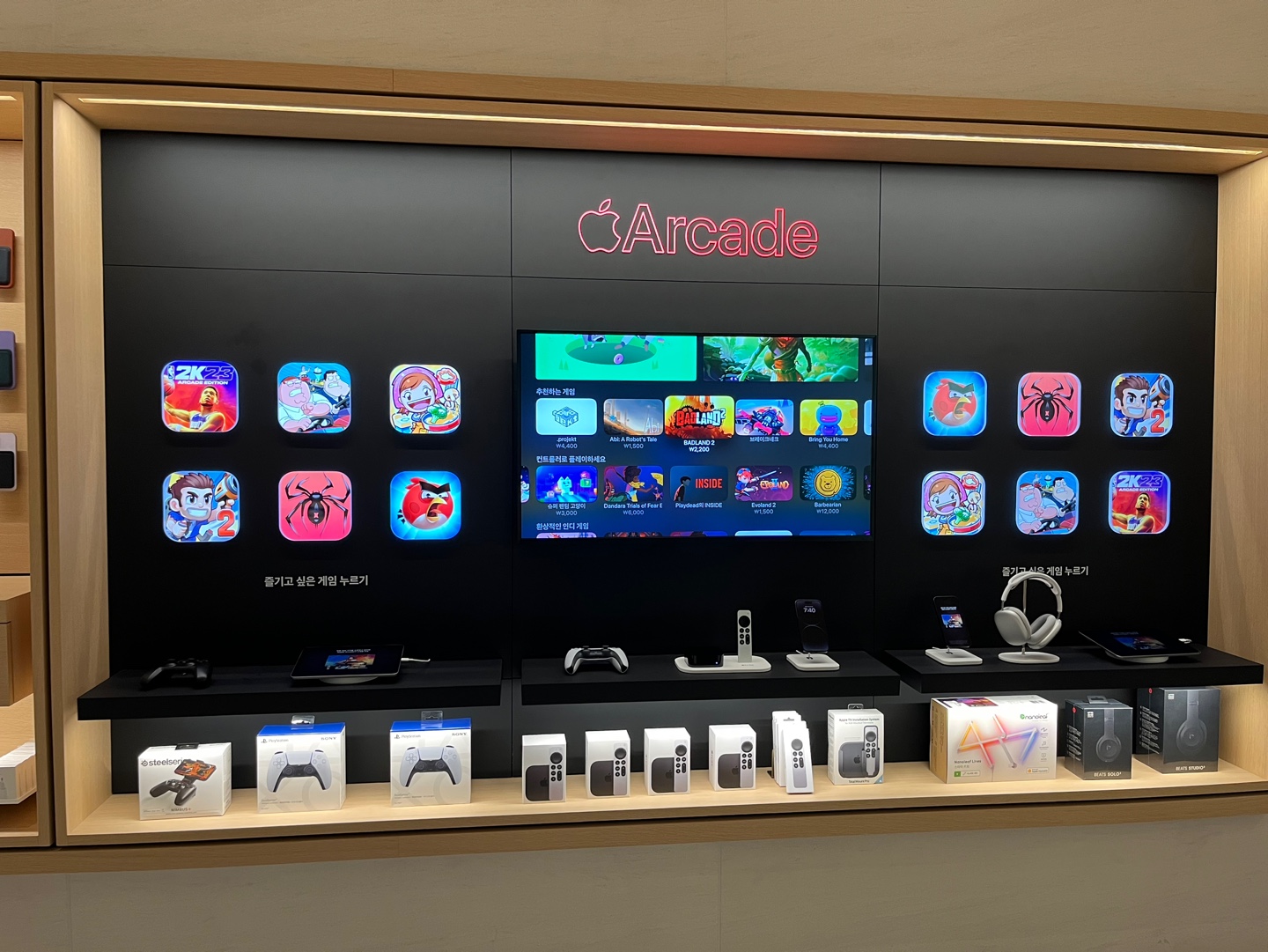 벽면에는 다양한 애플 제품 및 소품들이 진열되어 있습니다.