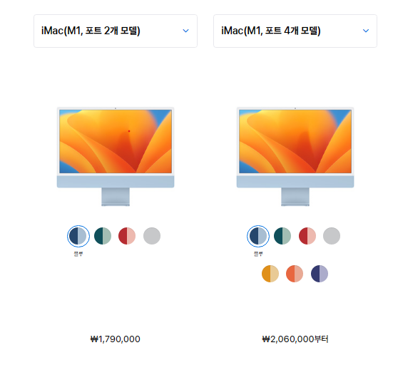 정말 정말 갖고 싶은 것 1위는 아이맥(iMac)이었습니다. 일체형 컴퓨터인데요. 위의 사진에 보이는 키보드와 마우스도 세트라고 해요. 저는 인터넷 검색, 블로그 작성, 간단한 문서작업만 하는지라 M1, 포트 2개 모델(179만 원)도 충분할 듯해요. 최신 아이폰과 비슷한 가격으로 컴퓨터를 장만할 수 있다고 합리화하게 되네요.
